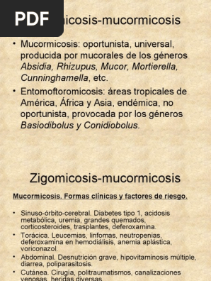 7 en 1962, roberts informó la forma de mucormicosis cutánea. La mucormicosis cutánea se clasifica en dos formas: Resumen —la zigomicosis (mucormicosis) cutánea es una enfermedad rara, causada por hongos zygomycetes oportunistas, que se asocia en primer lugar a diabetes descompensada y en segundo lugar a padecimientos hematológicos como leucemias. En la mucormicosis cutánea, la zona que rodea la herida en la piel puede aparecer caliente, enrojecida, hinchada y dolorosa. La mucormicosis cutánea tiene un pronóstico favorable, con mortalidad menor al 10%, cuando se realiza diagnóstico y desbridamiento quirúrgico precoz de la lesión, requiriendo como en nuestro, de cirugía reconstructiva pasada la fase aguda • tratamiento antifúngico, siendo de primera línea, para la mucormicosis invasora, anfotericina b.